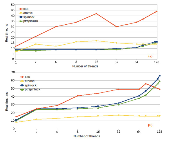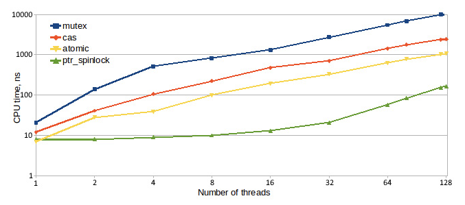 포인터 스핀락의 한 가지 장점은 보호되는 객체에 액세스할 수 있는 유일한 방법을 제공하는 한 실수로 경쟁 조건을 만들거나 락 없이 공유 데이터에 액세스하는 것이 불가능하다는 것이다. 두 번째 장점은 이 구현이 일반 스핀락보다 성능이 약간 더 뛰어나다는 것이다. 스핀락이 아토믹 연산보다 성능이 뛰어난지 여부는 하드웨어에 따라 다르며, 동일한 벤치마크라도 프로세서마다 다른 결과가 나온다. 아래 그래프는 서로 다른 두 프로세서에서 동일한 벤치마크를 테스트한 결과이다 (위 결과에 사용된 프로세서가 아래 결과의 프로세서보다 더 높은 세대의 intel CPU이다).