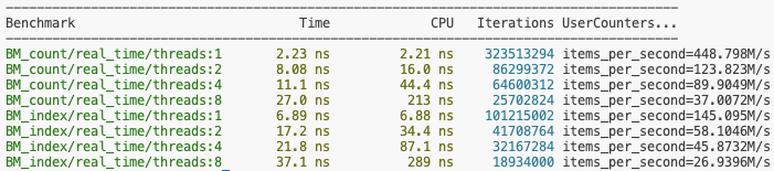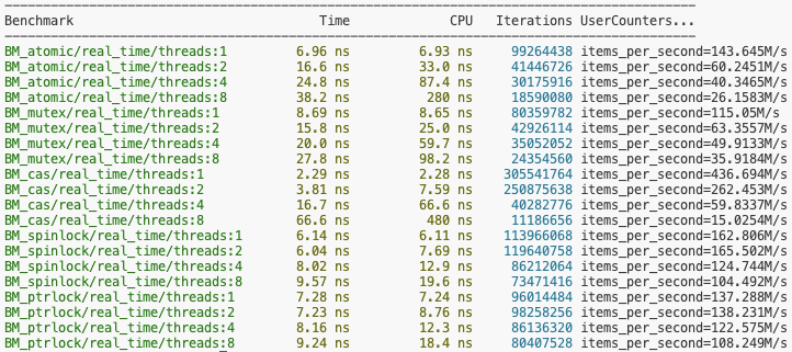 결과를 살펴보면, 구현에 관계없이 여러 스레드가 동시에 공유 데이터에 액세스하는 비용은 스레드 수에 따라 증가한다는 것이다. 그러나 효율성은 구현마다 크게 다르며, 특정 구현은 스레드가 8개가 될 때까지 크게 증가하지 않는 모습을 보여주기도 한다. 결과는 하드웨어마다 다르므로 타겟 플랫폼을 염두하고 측정한 뒤 선택해야 한다.