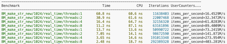위 벤치마크는 문자열을 초기화하는 작업에 대해서 성능을 측정하며, 매 반복마다 임의의 크기의 문자열 메모리를 할당하고 해제한다. 난수를 생성하는 것을 성능에 포함시키지 않기 위해 별도의 벡터를 설정하여 미리 난수를 계산해두고 있다.