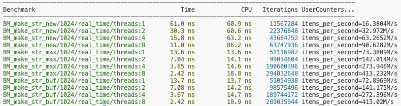 두 함수의 성능을 벤치마크로 측정해보자. 참고로, 벤치마크를 통해서 I/O 출력에 대한 성능을 측정하는 것이 아닌 복사 성능을 측정하는 것이 목적이므로 rand()을 통해서 컴파일러가 알아차리지 못하도록 출력하는 척만 하도록 구현되어 있다.
