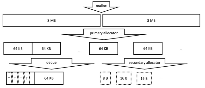 물론 64KB 블록을 더 작은 크기로 세분화하는 할당자에서는 균일한 크기로 할당하는 것이 아닌 한 여전히 파편화에 취약하다.