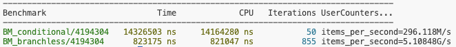 f1()에서 b의 값은 예측할 수 없기 때문에 비효율적이다. 하지만 f2()와 같이 branch가 없도록 바꿀 수 있다. 이러한 성능은 간단한 벤치마크로 확인할 수 있다.