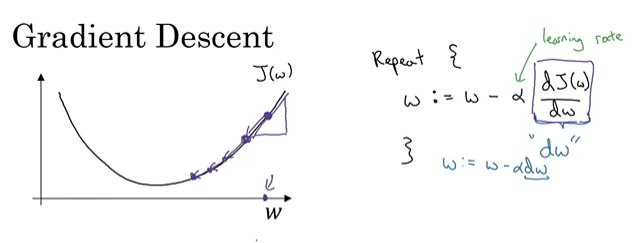 \[\begin{align*} \text{Repeat } \{ \\ w &:= w - \alpha\underbrace{\frac{dJ(w)}{dw}}_{dw} \\ \} \end{align*}\]