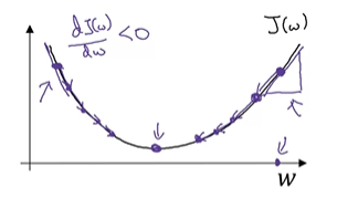 위 그래프처럼 제일 오른쪽 위치에서 Gradient Descent를 시작한다면, 미분항 dw는 그 지점에서의 기울기이므로 양수이다. \(\alpha\)값도 양수이고 미분항도 양수이기 때문에, w의 값은 점점 감소하므로 Global Optima로 향하게 된다.
