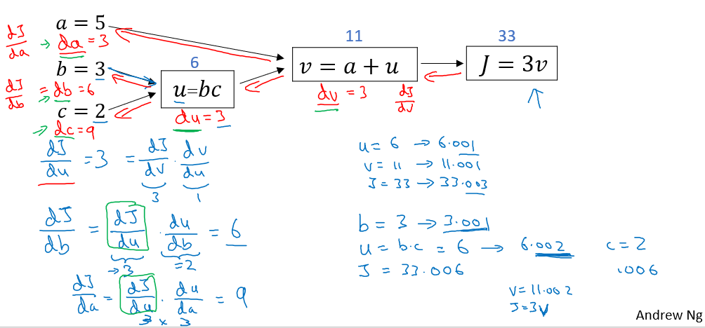 \[\begin{matrix} \frac{dJ}{du} = 3 & \frac{dJ}{db} = 6 & \frac{dJ}{dc} = 9 \end{matrix}\]