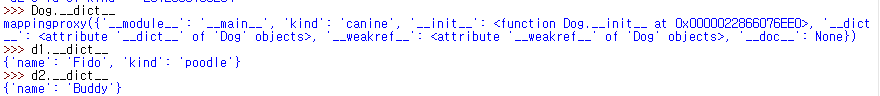 이는 각 객체의 심볼테이블을 보면 쉽게 확인이 가능합니다. 객체의 심볼은 __dict__ 변수로 확인가능합니다.