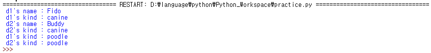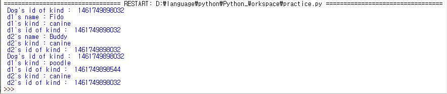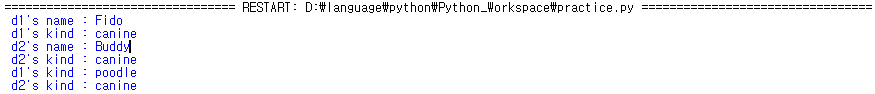 d1.kind에 값을 변경하기 전까지 모두 같은 주소를 가지고 있으며, 공유하고 있는 것을 볼 수 있습니다. 그러나, d1.kind의 값을 변경하면, d1.kind의 주소가 변경이 되는 것을 볼 수 있습니다. 즉, d1.kind로 접근하는 순간, d1 객체에 객체 변수 kind를 생성해 버리는 것입니다. 그래서 d1 객체에는 클래스 변수 kind와 객체 변수 kind가 동시에 존재하고 있고, d1.kind를 통해서 우리는 객체 변수에 먼저 접근을 하게 됩니다.