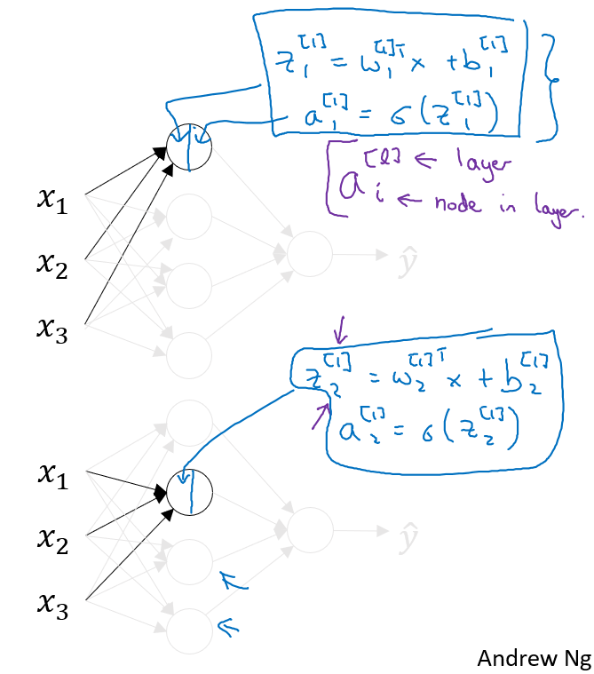 첫번째 activation노드에서 \(z_1^{[1]} = w_1^{[1]^T}x + b_1^{[1]}\)가 계산되고, 여기에 sigmoid function이 적용되어서 \(a_1^{[1]} = \sigma(z_1^{[1]})\)가 구하게 되며, 여기 \(a_i^{[l]}\)에서 \(l\)은 layer를 의미하고 i는 해당 layer에서의 i번째 노드를 의미한다.