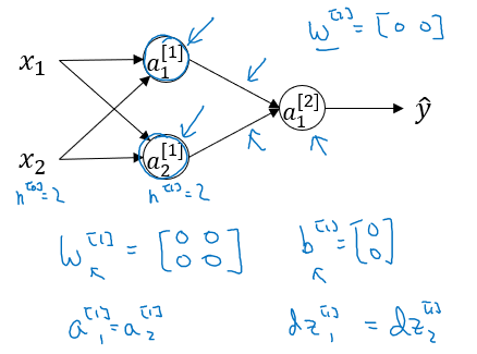 위 NN에서 \(W^{[1]}, b^{[1]}, W^{[2]}, b^{[2]}\)를 모두 0으로 초기화 했다고 하자. 여기서 bias term은 실제로 0으로 초기화해도 무방하다. w를 0으로 초기화하는 것이 문제가 된다.