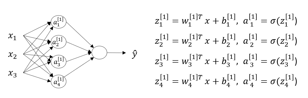 \[W^{[1]} = \begin{bmatrix} -- w_1^{[1]^T} -- \\ -- w_2^{[1]^T} -- \\ -- w_3^{[1]^T} -- \\ -- w_4^{[1]^T} -- \end{bmatrix}\]