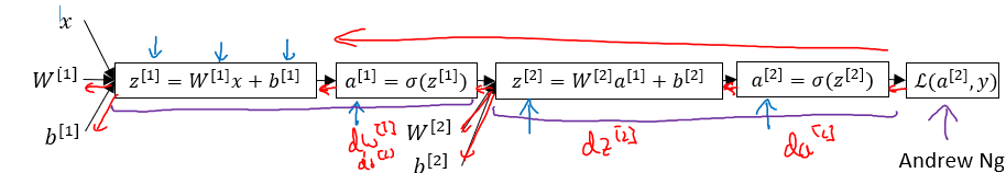 이 결과값으로 Cost Function을 구하고, 다시 뒤로 돌아가면서 BP를 진행하면서 \(da^{[2]}, dz^{[2]}, dW^{[2]}, db^{[2]}\)를 구하고, 다시 \(da^{[1]}, dz^{[1]}, dw^{[1]}, db^{[1]}\)을 구하는 것이다.