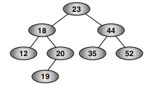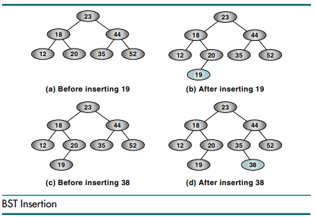 위 BST에서 19를 삽입할 때, 노드부터 출발해서 19가 들어갈만한 위치를 찾는 거죠. 23보다 작으니 왼쪽으로, 그리고 18보다 크니 오른쪽으로, 마지막으로 20보다 작으니 왼쪽 서브트리로 가는데, 비어있으므로 20의 왼쪽 노드에 위치시키면 되는 겁니다. 38도 마찬가지로 동일한 과정을 거쳐서 위치하게 됩니다.