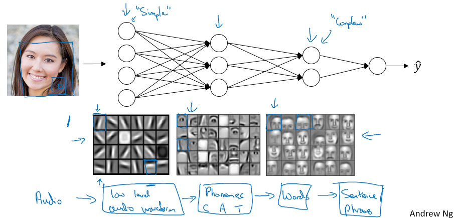 얼굴 사진을 입력했을 때, 첫 번째 layer는 feature detector 또는 edge detector 일 수 있다. 위 예제는 입력된 이미지에서 20개의 hidden layer를 통해서 DNN이 계산하는 것을 나타낸 것이고, 아래 사각형의 박스로 hidden unit을 시각화했다. 첫 번째 층에서 hidden unit은 이미지 모서리가 어딘지 파악한다. (나중에 CNN에 대해서 배우게 되면 더 이해가 빠를 것이다.), 그리고 파악된 모서시들을 그룹으로 묶어서, 얼굴의 일부를 만들어 나가게 되는데, 모서리들을 취합하는 과정에서 얼굴의 다른 부분들을 감지할 수 있는 것이다. 그리고 최종적으로 여러 얼굴 부위들을 합치게 된다.