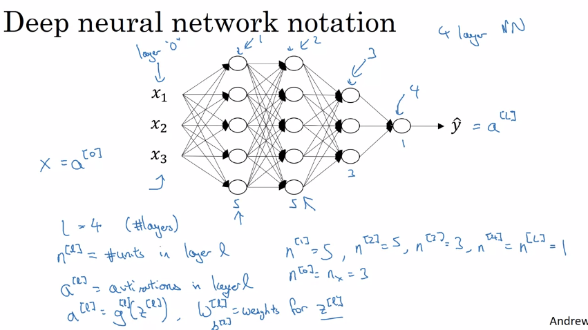 \[\begin{align*} Z^{[1]} &= W^{[1]}A^{[0]} + b^{[1]} \\ A^{[1]} &= g^{[1]}(Z^{[1]}) \\ Z^{[2]} &= W^{[2]}A^{[1]} + b^{[2]} \\ A^{[2]} &= g^{[2]}(Z^{[2]}) \\ \hat{y} &= g^{[4]}(Z^{[4]}) = A^{[4]} \end{align*}\]