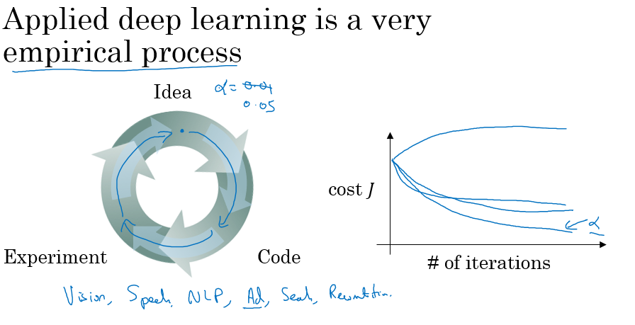사실 가장 좋은 hyperparameter 값이 어떤 것인지 미리 알아내는 것은 매우 어렵다. 그래서 딥러닝을 적용할 때, 우리는 아래와 같이 다양한 아이디어를 가지고 시도해보고 그 결과를 바탕으로 다시 하이퍼 파라미터 값들을 변경해서 다시 시도해보는 방법 밖에 없다.