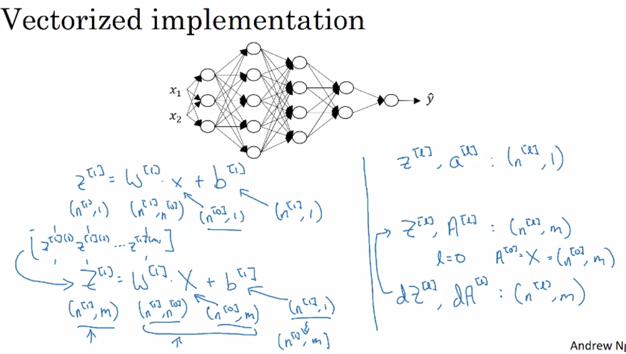 - \(Z^{[l]}, A^{[l]} : (n^{[l]}, m)\), if \(l = 0\), \(A^{[0]} = X : (n^{[0]}, m)\)