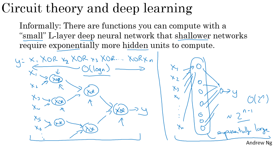 우리가 만약 \(x_1\) XOR \(x_2\) XOR \(x3\) XOR \(\cdots x_n\)을 계산하려고 한다면, 왼쪽 경우처럼 XOR Tree를 그려가면서 최종적인 결과 \(y\)를 구할 수 있을 것이다(엄밀히 이야기하면 XOR를 계산하는데 AND와 NOT게이트를 이용해 2개의 layer로 XOR을 구할 수 있다). 여기서 XOR을 계산하기 위한 네트워크의 깊이는 \(logN\)이 될 것이다.