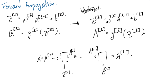 \[\begin{align*} Z^{[l]} &= W^{[l]}A^{[l-1]} + b^{[l]} \\ A^{[l]} &= g^{[l]}(Z^{[l]}) \end{align*}\]