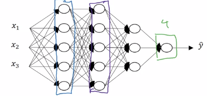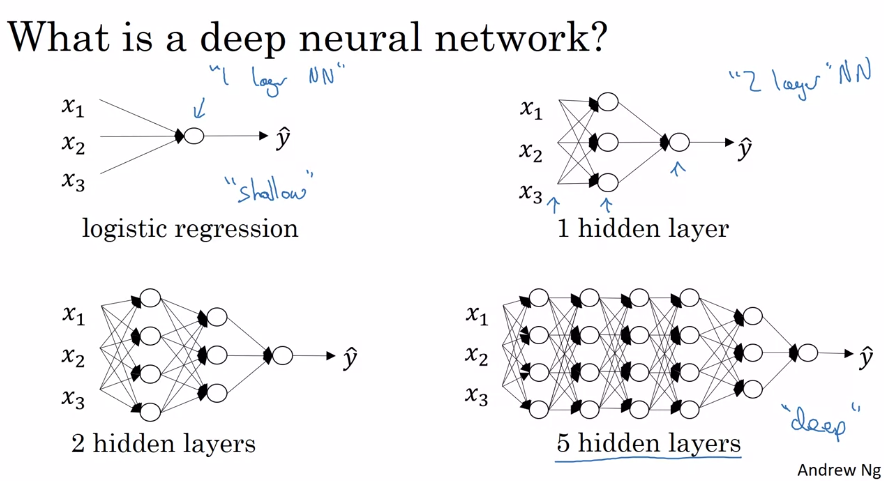 왼쪽 위는 Logistic Regression이고 오른쪽 위는 1개의 Hidden Layer로 이루어진 NN이다. 이러한 모델을 'Shallow'한 모델이라고 표현한다. 반면에 오른쪽 아래와 같이 5개의 Hidden Layer로 이루어진 NN을 'Deep'한 모델이라고 표현한다. 차이는 Hidden Layer의 차이밖에 없다.