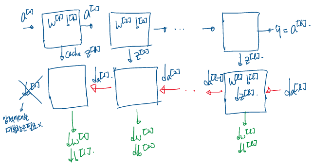 이렇게 FP와 BP를 통해서 \(dw^{[l]}\)와 \(db^{[l]}\)을 구해서, \(w, b\)를 갱신하게 된다.