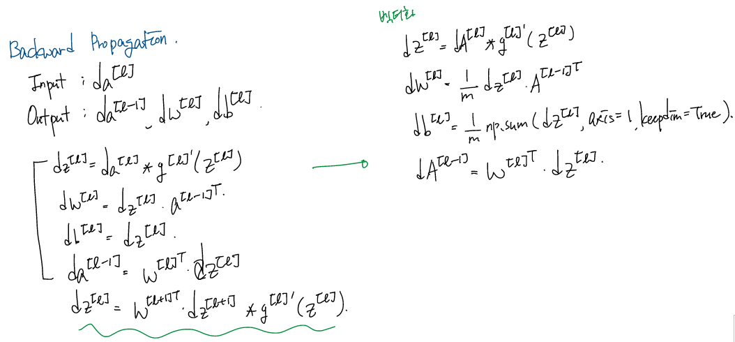 - BP : Input \(da^{[l]}\), Ouput \(da^{[l-1]}, dw^{[l]}, db^{[[l]}\)