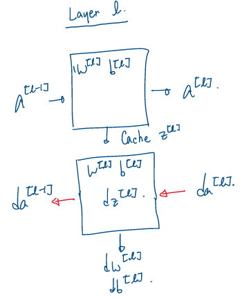 여기서 cache는 FP에서 계산한 \(z^{[l]}\)이 BP에서 \(dz^{[l]}\)을 구하는데 다시 사용되기 때문에 저장해놓은 것을 의미한다.