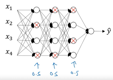 이렇게 무작위로 unit을 제거하게 되면, 더 작은 NN으로 학습하는 것과 동일하기 때문에, 더 작은 NN을 사용하면 Regularization 효과를 가져야하는 것처럼 보인다.