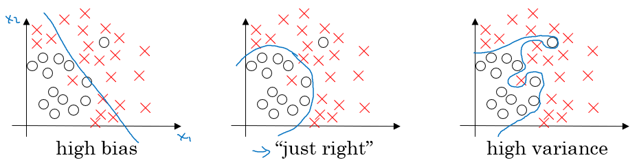 만약 파란색 그래프처럼 데이터를 overfitting한다면, curve function이거나 2차함수이기 때문에 high variance 문제가 발생한다. 그리고 고차원의 입력을 갖는 경우에도 overfitting, 즉, high variance 문제를 가질 수 있다.