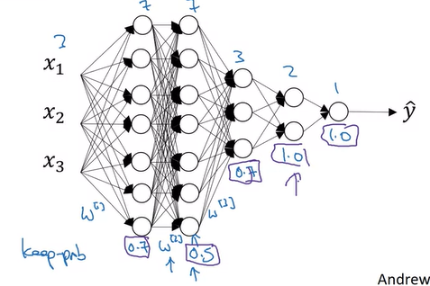 W1은 7x3 matrix, W2는 7x7 matrix, W3는 3x7 matrix이고, W2가 가장 큰 matrix라고 볼 수 있다. 우리는 이 W2 matrix의 overfitting을 방지하기 위해서 두 번째 층의 keep_prob를 낮게 설정할 수 있을 것이다. 즉, overfitting이 우려되는 layer에는 keep_prob를 낮게 설정하고, 걱정되지 않는 layer에는 높게 설정하는 것이다.