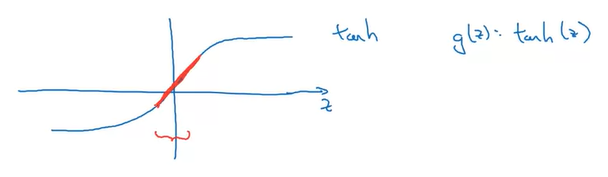 위와 같은 tanh 함수가 있을 때, z의 값이 작으면 우리는 빨간색으로 표시된 tanh의 선형 부분만 사용할 것이다.