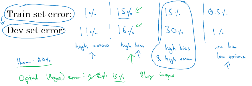 두 번째로 Train set error가 15%, Dev set error가 16%라고 해보자. 이 경우에 Human error가 0%의 오류라고 한다면, 해당 알고리즘은 training set과 dev set 모두 잘 동작하지 못하고, 학습 알고리즘이 data에 잘 fitting 되지 않은 경우로 underfitting 문제라고 볼 수 있다. 그래서 이 알고리즘은 High Bias 문제를 갖고 있다고 할 수 있다.
