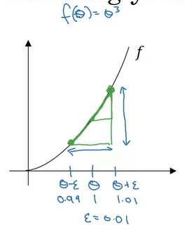 위와 같은 그래프를 같는 \(f(\theta)\) 함수의 기울기를 구해보자. 이때 구하는 지점은 \(\theta = 1\)이다. 그리고 \(\epsilon\)값을 0.01로 두고 \(\theta\)값에서 뺴고 더한다.