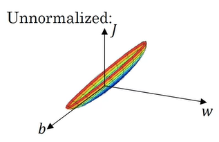 표준화 되지 않은 input feature를 사용하게 되면, 아래와 같은 J 그래프를 얻을 수 있다.