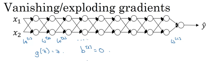 결국 결과값에 \(1.5^L\)이 곱해지므로, 매우 deep한 NN일 경우에는 결과값 \(\hat{y}\)가 기하급수적으로 증가할 것이다.