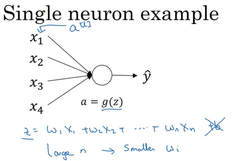 이런 경우에 적절한 z값을 갖기 위해서 n이 많을 수록, w는 더 작아져야 한다.