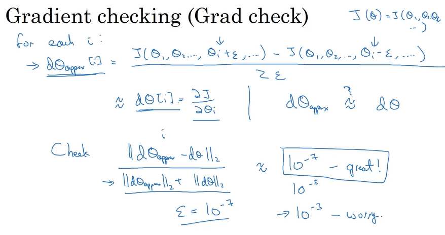 모든 i에 대해서 기울기 근사치를 구하는 것은 계산 시간이 매우 오래 걸린다. 따라서 디버깅할 때만 사용하고, 만약 충분히 오차가 작은값이 나온다면 Gradient Checking은 끄는 것이 좋다.