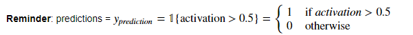 \[\tag{5} y^{(i)}_{\text{prediction}} = \left\{\begin{matrix} 1 && \text{if } a^{[2](i)} > 0.5 \\ 0 && \text{otherwise} \end{matrix}\right.\]
