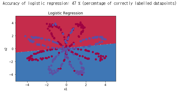 신경망을 구성하기 전에 간단히 Logistic Regression을 수행해서 구역을 분리해 봅시다. sklearn의 내장된 클래스를 사용해서 수행해보겠습니다.