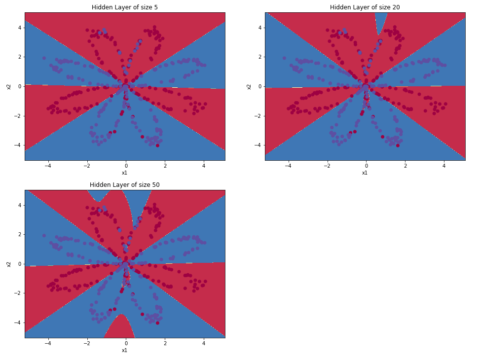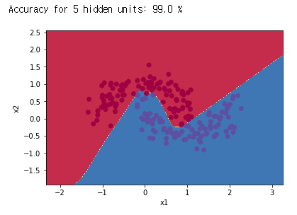 hidden layer의 크기를 5로 설정했고, 매우 정확하게 decision boundary를 설정했습니다.
