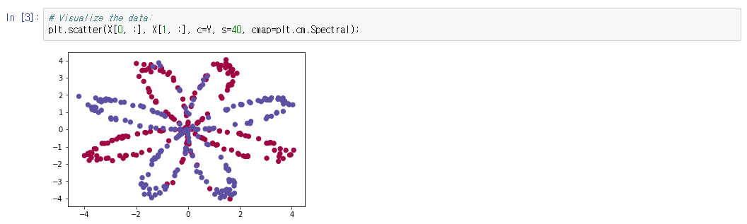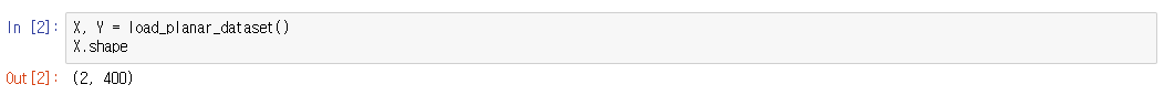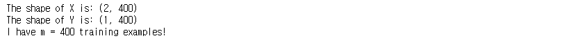 X의 차원은 (2, 400), Y의 차원은 (1, 400)이며, 우리는 샘플의 개수 m이 400이라는 것을 알 수 있습니다. 샘플은 각 포인트가 되는 것이죠.