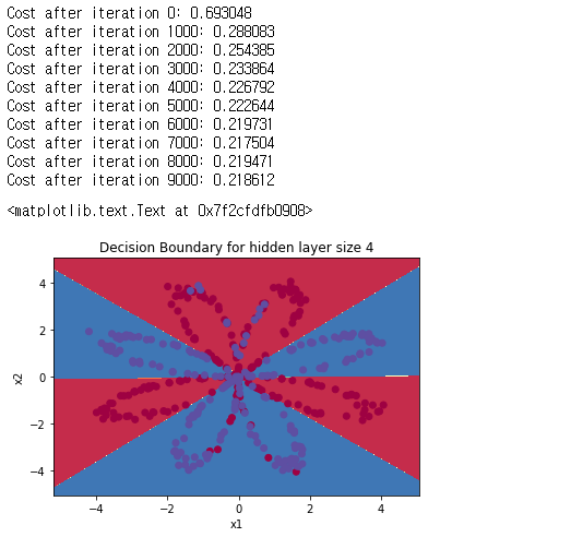이렇게 구현한 nn_model로 X, Y 데이터와 hidden layer의 size를 4로 설정해서 학습하게 되면 아래와 같은 결과를 얻을 수 있습니다.