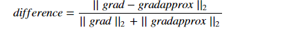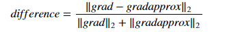 그리고 gradient와 gradient 근사치의 relative difference를 다음의 식을 통해서 구합니다.