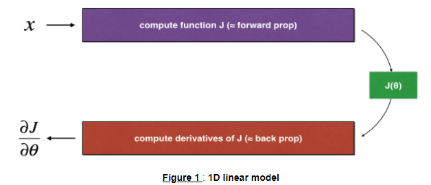 1차원 linear function\(J(\theta) = \theta x\)가 있을 때, 이 모델은 single-valued parameter \(\theta\)와 input \(x\)로 이루어져있다. 우리는 J와 \(\frac{\partial J}{\partial \theta}\)을 계산하고, gradient checking을 통해서 구한 gradient가 맞는지 확인하면 됩니다.