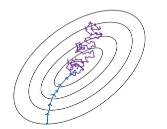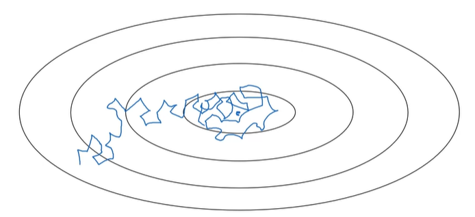 mini-batch GD를 사용한다고 가정해보면, 우리는 학습을 반복하면서 최소값으로 향하는 경향이 있지만, 정확하게 최소값으로 수렴하지는 않을 것이다.