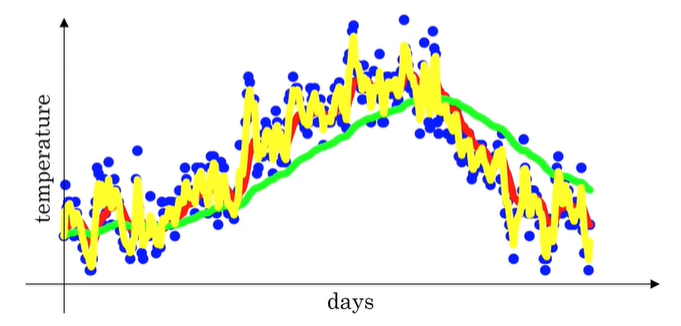 만약 \(\beta = 0.5\)라면 2일간의 평균 기온이기 때문에 아래 노란색 그래프처럼 매우 noisy한 결과를 얻을 것이고, outlier에 취약하게 된다. 하지만 기온이 변하는 것을 더 빨리 반영시켜준다.