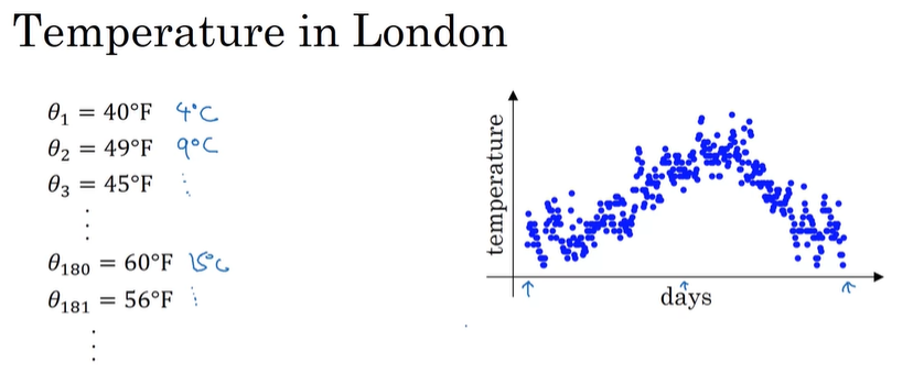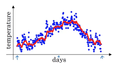 1년간의 런던 날씨를 표로 나타내면 오른쪽과 같이 나타낼 수 있다. 정형화되어 있지 않고, 모든 날씨데이터를 모두 나타내어서 noisy하게 보이는데, 날씨 변화 trend를 구하고 싶은 경우 local평균 또는 온도에 대한 이동 평균값을 구하기 위해서는 아래와 같이 구하면 된다.