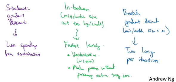 그리고 mini-batch size가 1인 경우에는 Stochastic Gradient Descent(확률적 경사하강법)이라고 하는데, 각각의 example하나가 mini-batch가 되는 것이다.