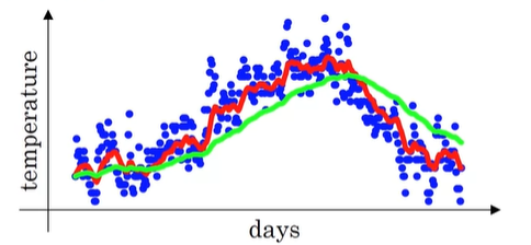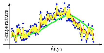 위 식에서 beta의 값을 0.9, 0.98, 0.5로 설정했을 때, 위와 같은 빨간색/초록색/노란색 그래프를 얻을 수 있었는데, 조금 더 수학적으로 일별 평균 기온을 어떻게 산출하는지 살펴보도록 하자.