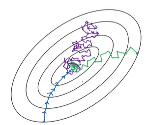 이 두 가지의 경우에서 최적의 값을 찾아가는 모습을 보면 아래와 같다. 파란색이 batch GD이고, 보라색이 Stochastic GD를 나타낸다.