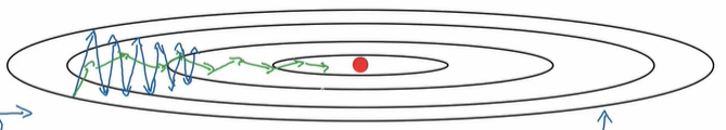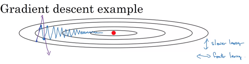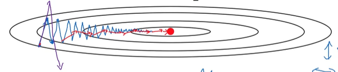이해를 돕기 위해서 세로축을 파라미터 b라고 하고 가로축을 파라미터 w이라고 할 때, 우리는 세로축은 더 느리고 가로축은 더 빠르게 학습하기를 원한다.